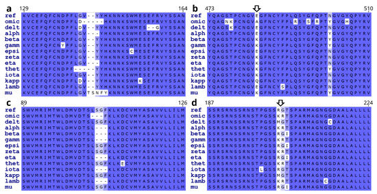 Examples of SARS-CoV-2 protein mutations across the variants of concern/interest. (a). Substitutions, deletions, and insertions in the S protein (near the N-terminus). (b). Substitutions in the S protein (in the receptor binding domain). (c). Deletions and substitutions in the NSP6. (d). Substitutions in the N protein. Arrows point to some of the mutation hotspots. Labels on the left of each panel denote the reference SARS-CoV-2 (ref) or the variants. Numbers above the panels indicate positions of the marked amino acids in the reference viral proteins. See the legend to Figure 2 for abbreviations of the SARS-CoV-2 variants.