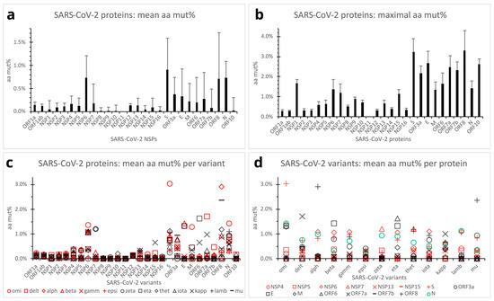 Mean aa percent mutations per viral protein per SARS-CoV-2 variant of concern/interest are presented in Figure 4c,d. As depicted, mean aa percent mutations in the S, ORF8, N, NSP6, ORF7a, and ORF6 proteins varied to a significant extent across the variants. The ORF3a, E, M, and NSP7 proteins also showed moderate to marked mean aa mut% in certain SARS-CoV-2 variants. In contrast, the ORF1a, ORF1ab, ORF10, and most other NSPs presented constantly low aa mut% across all the variants. Interestingly, the omicron variant had a much higher mean aa mut% in the structural (S, N, M, and E) and NSP6 proteins, and the delta variant had higher mean aa mut% in the ORF7a, whereas the alpha and mu variants exhibited high mean aa mut% in ORF8 (Figure 4c,d).
