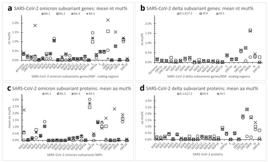Some SARS-CoV-2 variants have further evolved into subvariants along the course of spreading and infection. To better understand mutation variations among subvariants, three other omicron (BA.2, BA.4, BA.5) and two other delta subvariants (AY.4, AY.5) were chosen for comparison with the supposedly root omicron subvariant BA.1 and delta subvariant B.1.617.2, respectively (Table 1 and Table 2). Thirty genome clones were sampled for each of the subvariants. The results revealed no significant difference in mean genome nt mut% in the in-variant subvariants. At the protein and gene levels, the omicron BA.2, BA.4, and BA.5 subvariants, like the BA.1, also maintained relatively high aa/nt mut% in the NSP6, S, N, E, and M proteins/genes (Figure 5a,c); the delta AY.4 and AY.5 subvariants, like the B.1.617.2, retained a relatively high mean aa/nt mut% in ORF7a (Figure 5b,d). In comparison with the BA.1, however, the omicron BA.2 subvariant showed a more marked mean aa/nt mut% in ORF6, whereas the BA.4 had higher mean aa/nt mut% in NSP1, ORF6, and ORF7b (Figure 5a,c). Relative to the B.1.617.2, the delta AY.4 and AY.5 subvariants presented higher aa/nt mut% in the ORF7b and ORF8 proteins/genes (Figure 5b,d). See Table 2 for further details of the omicron and delta subvariants’ mutations.