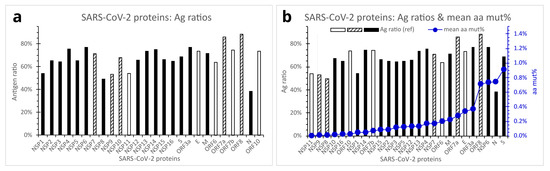 Antigen ratios of reference SARS-CoV-2 proteins in relation to mean aa mut% in the proteins across the variants of concern/interest. (a). Ag ratios of reference SARS-CoV-2 viral proteins. (b). Comparison of SARS-CoV-2 proteins with regard to Ag ratios of reference SARS-CoV-2 proteins (bars) and mean aa mut% in the viral proteins across the variants of concern/interest (closed circles). Open bars denote viral proteins measuring 11–75 aa residues in length, hatched bars denote viral proteins measuring 83–139 aa residues, and filled bars denote viral proteins measuring 180–1945 aa residues. Abbreviations: Ag, antigen; aa mut%, percent mutation of amino acid residues; E, envelope protein; M, membrane protein; N, nucleocapsid protein; NSP, nonstructural protein; ORF, open reading frame; S, spike protein.