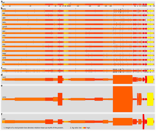 Typical mutation sites of SARS-CoV-2 variants of concern/interest, and quantification of mutations in major viral proteins and variants. (a). A schematic diagram showing the arrangement of SARS-CoV-2 proteins/genes in the viral genome, and the predicted antigen ratios of reference SARS-CoV-2 proteins. Yellow-colored protein boxes denote relatively low Ag ratios, whereas red-colored protein boxes denote relatively high Ag ratios. Note that non-canonical overlapping SARS-CoV-2 genes were not analyzed here or shown as individual entities. (b). Typical mutation sites of individual SARS-CoV-2 variants of concern/interest. Note the variable mutation profiles of the variants. Each mutation site is represented by a vertical bar. Mutations found in all clones of a variant are denoted by tall vertical bars, those found in over 80% but less than 100% of the clones by intermediate-height vertical bars, and mutations found in over 50% but less than 80% of the clones by short vertical bars. (c). Cumulative typical mutation sites in different SARS-CoV-2 proteins and variants of concern/interest. (d). Mean mut% in SARS-CoV-2 proteins [range: 0.000% (NSP11) to 0.909% (S)] across the variants of concern/interest (n = 187 clones of 13 variants) as represented by the relative heights of the viral protein boxes. (e). Mean mut% in SARS-CoV-2 proteins [range: 0.000% (e.g., NSP7, ORF10) to 3.043% (S)] in the omicron variant (n = 15 clones) as represented by the relative heights of the viral protein boxes. (f). Mean mut% in SARS-CoV-2 proteins [range: 0.000% (e.g., NSP7, NSP11) to 1.708% (ORF7a)] in the delta variant (n = 15 clones) as represented by the relative heights of the viral protein boxes. Comparison of panels (e,f) shows obvious differences between mutation profiles of the omicron and delta variants. Abbreviations: 10, ORF10; 3a, ORF3a; 6, ORF6; 7a, ORF7a; 7b, ORF7b; 8, ORF8; arrow, NSP11; e, envelope viral protein; m, membrane viral protein; n1–n16, NSP1–NSP16 viral proteins; N, nucleocapsid viral protein; S, surface viral protein; VsCI, variants of concern/interest; *, mutations found in all clones and variants of concern/interest. See Figure 2 and Figure 4 for other abbreviations.