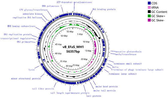 Whole-genome sequencing analysis of WH1 revealed a double-stranded DNA genome with a length of 56,357 bp and a G+C content of 39.21% (Figure 2). BLAST analysis of nucleic acid revealed 95.81% homology of WH1 with the published E. faecalis phage EF-P29 (GenBank: KY303907.1) and 95.69% homology with EF-P10 (GenBank: KY472224.1).