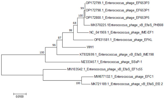 Cluster analysis of E. faecalis phage WH1. The phylogenetic tree was constructed using the neighbor-joining method based on the terminase large subunit.
