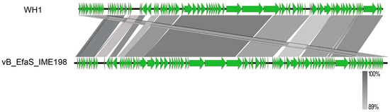 Genome homology analysis of phage WH1 with vB_EfaS_IME198. The green arrows indicates the open reading frames. The color gradient indicates the level of nucleotide identity between the phage genomes.