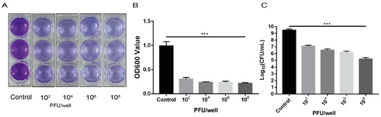 The initial titer of phageWH1 was 102, 104, 106, or 108 PFU/well. The biofilm biomass was obtained after incubation for 24 h. (A) Crystal violet staining analysis. (B) Optical density values measured at 600 nm. (C) The result of the plate count. The results are expressed as the mean ± SD (standard deviation) of three independent experiments. The t-test method was used to detect significant differences between control and test samples. *** p < 0.001.