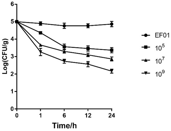 Phage WH1 showed a typical dose-dependent inhibition of E. faecalis EF01 (Figure 6). The concentration of E. faecalis decreased by approximately 2.7 log after adding 109 PFU bacteriophage for 24 h. As the phage dose decreased, the inhibition efficiency decreased. The concentration of E. faecalis in the control samples without phage treatment approached the initial concentration after 24 h of incubation.