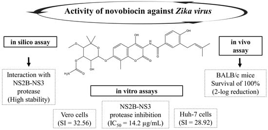 The prediction results from the in silico studies herein reviewed demonstrate the potential activity of NPs against molecular targets of ZIKV. The judicious validation of compounds exhibiting the best docking scores, through in vitro and in vivo assays, might disclose promising compounds for developing new drugs to fight ZIKV infection and minimize ZIKV-mediated pathologies []. Computational approaches generate activity predictions that can contribute to accelerate the development of new active compounds in addition to predictions of pharmacokinetics and the safety of anti-ZIKV compounds []. However, data generated by in silico assays must be carefully analyzed, keeping in mind the need to correlate them with in vitro and in vivo test results.