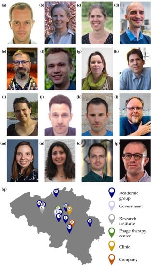 Sixteen co-founders of the Belgian Society for Viruses of Microbes and their affiliations. From west to east: (a) Ghent University (Yves Briers); (b) University of Applied Sciences Ghent (Els Van Mechelen); (c) Flanders Research Institute for Agriculture, Fisheries and Food (ILVO) (Jolien Venneman); (d) University of Antwerp (Dieter Vandenheuvel); (e) Queen Astrid Military Hospital (Jean-Paul Pirnay); (f) Sciensano–Federal agency of public health (Pieter-Jan Ceyssens); (g) Vrije Universiteit Brussel (Eveline Peeters); (h) Université libre de Bruxelles (Abel Garcia-Pino); (i) UCLouvain (Annika Gillis); (j) KU Leuven (Abram Aertsen), (k) KU Leuven (Jelle Matthijnssens), (l) KU Leuven (Rob Lavigne); (m) University Hospitals Leuven (Jolien Onsea); (n) University of Namur (Gipsi Lima-Mendez); (o) Vésale Bioscience (Bob Blasdel); (p) University of Liège (Damien Thiry); (q) Geographical location of the different founders. The labels correspond to the different founders from the previous panels.