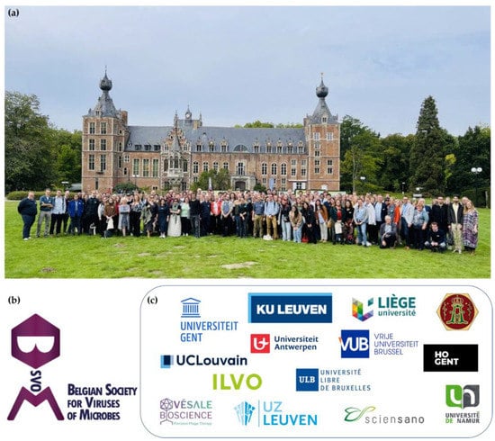 Belgium holds a long-standing position in the field of microbial viruses, dating back to the early works of André Gratia on Staphylococcus aureus phages and the first experimental therapeutic use of phages by Richard Bruynoghe and their student Joséph Maisin, both in 1921 [1]. René Appelmans developed a liquid method of phage titration called the “Appelmans protocol”, which became the base for the preparation of a large number of phage cocktails targeting a broad range of pathogenic bacteria in Georgia [2,3] and is nowadays frequently used for phage adaptation to bacterial hosts, which is known as “phage training”. Pioneering work in the field continued with the discovery of positive regulation of gene expression in phage lambda by René Thomas and coworkers in 1966, the first viral genome (MS2) sequenced by the group of Walter Fiers in 1976 and, more recently, a highly advanced regulatory framework for phage therapy actively applied in Belgian hospitals, known as magistral phage therapy [4,5,6]. Today, Belgium has a vibrant and diverse community of phage (and other microbial virus) researchers. Based on this premise, the Belgian Society for Viruses of Microbes (BSVoM) was founded as a non-profit organization (www.bsvom.be, accessed on 20 May 2023) on 9 June 2022, with its associated articles being published in the Belgian official gazette. The BSVoM aims to sustain and improve the dense Belgian research and development network on viruses of microbes by bringing together all stakeholders from academia, government and industry. Moreover, this national society is formally associated with the International Society for Viruses of Microorganisms (www.isvm.org, accessed on 20 May 2023). In spite of the small geographical size of Belgium, at least fourteen entities are currently active in the field of viruses of microbes, all represented by at least one co-founder (Figure 1). In its foundation assembly, Prof. Annika Gillis (UCLouvain), Dr. Pieter-Jan Ceyssens (Sciensano) and Prof. Yves Briers (Ghent University) were elected as secretary, treasurer and chair for three years. Our society adopts the triple helix model, providing an interdisciplinary perspective ranging from basic research to industrial developments and biotechnological and clinical applications. The BSVoM pursues the intensification of this fertile Belgian ecosystem on viruses of microbes, with a particular focus on supporting young and future generations in the field. The society counts today 237 members (status on 11 May 2023) and is supported by Vésale Bioscience (phage.health, accessed on 20 May 2023) as its main society sponsor. Vésale Bioscience is a Belgian biotech company created in 2018 as a spin-out of Vésale Pharma, developing personalized phage therapy solutions.