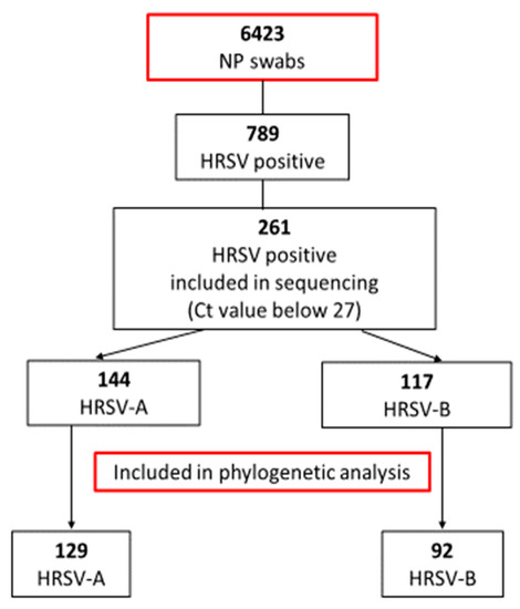 From January 2018 to December 2021, a total of 125,072 nasopharyngeal swabs (NPs) from pediatric patients (aged 0 to 18 years) were sent to the Institute of Microbiology and Immunology, Faculty of Medicine, University of Ljubljana, for routine molecular detection of respiratory viruses. From these, 6423 NPs originated from hospitalized children at the Pediatric Unit of the Ljubljana University Medical Center, thus excluding the 118,649 children tested only for SARS-CoV-2 since these include also the screening of asymptomatic individuals. From all 6423 NPs of hospitalized children, 789 were HRSV-positive (from 6 days to 10 years old) and 261/789 HRSV samples contained suitable viral loads (Ct < 27) to be included in further analysis (Figure 1). After sequencing, 129 HRSV-A and 92 HRSV-B samples displayed sequences of suitable length and quality for phylogenetic analysis. The National Medical Ethics Committee of the Republic of Slovenia approved the study protocol on 18 September 2020 (no. 0120-349/2020-6).