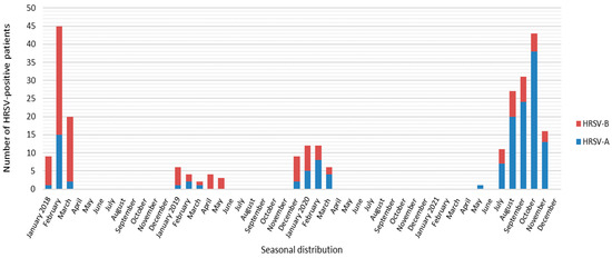 In 2018 and 2019, the seasonality of HRSV cases remained as seen before the SARS-CoV-2 pandemic. After the appearance of the first positive case of SARS-CoV-2 in Slovenia on 4 March 2020, the number of HRSV-positive cases began to decline rapidly. Between July 2020 and May 2021, no cases of HRSV were detected at all (Figure 2). After a 1-year period without the usual HRSV epidemic pattern, positive cases started to reappear and very quickly increased in number during late spring and summer 2021 after alleviating SARS-CoV-2 preventive/protective measures.