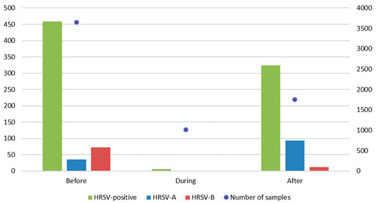 Distribution of total samples for respiratory viruses’ molecular diagnostics in correlation with detected HRSV cases among pediatric patients before the SARS-CoV-2 pandemic from January 2018 to March 2020 (Before) and introduction of preventive measures from March 2020 to March 2021 (During) and after measures started being lifted from March 2021 to December 2021 (After). The left axis shows the number of HRSV-positive samples with red bars representing the total number of HRSV-positive samples, green HRSV-A, and purple HRSV-B. The right axis shows the total number of samples tested for respiratory viruses (blue dots).