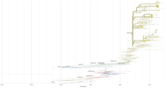 All 129 Slovenian HRSV-A sequences contained the 72-nucleotide-long duplicated region at the end of the G gene and were closely related to the original Canadian ON1 genotype (GeneBank acc. no. JN257693) first detected in 2010, and all of them, regardless of the year of collection, were further classified by Nextclade as lineage GA2.3.5 (Table 1 and Figure 4).