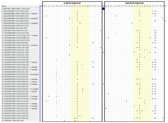 The amino acid analysis of the hypervariable attachment protein of the HRSV-A subgroup—the original region (amino acids 261–283) and repeated region (amino acids 285–307) compared with the original Canadian ON1 genotype (GeneBank acc. no. JN257693)—is shown in detail in Figure 6 and Table 2. Numerous amino acid changes were observed with variable frequencies over the investigating period independently in both regions (the original and the repeated regions). In greater detail, we compared the highly conserved sequence motif (GYLSPSQ) as seen in the original Canadian ON1 genotype (GeneBank acc. no. JN257693), where the exact-same motif was duplicated (amino acids 272–278 and 296–302) with the 129 Slovenian HRSV-A strains. Only in three Slovenian sequences did the motif GYLSPSQ remain the same in both regions. In 26/129 (20.2%) sequences, one mutation was found in the first region and two mutations in the second region (motif GYPSPSQ in the duplicated region to motif GHPSPSQ in the repeated region). On the other hand, in 13/129 (10.1%) Slovenian sequences, two mutations were found in the originating region (motif GYPSQSQ) and only one mutation in the repeated region (motif GYPSPSQ). All other motifs in both regions occurred at lower frequencies (Figure 6).