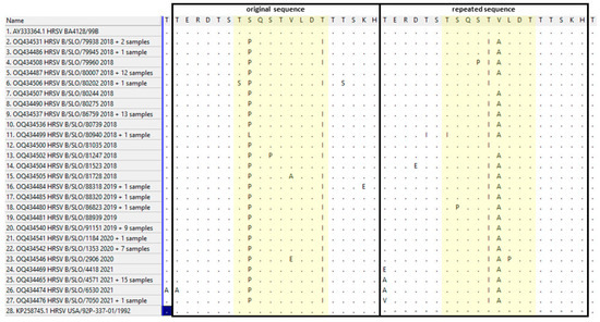 All Slovenian HRSV-A strains contained the 72-nucleotide-long duplicated region in the attachment glycoprotein G gene, closely related to the original Canadian ON1 strain, and were additionally classified as lineage GA2.3.5. All Slovenian HRSV-B strains similarly contained the 60-nucleotide-long duplicated region in the attachment glycoprotein G gene, closely related to the English BA, and were additionally classified as lineage GB5.0.5a. These two genotypes also currently dominate the world map of known HRSV lineages (https://doi.org/10.21105/joss.03773, accessed on 28 February 2023), confirming that our population is no exception to the worldwide evolution pattern of HRSV. Amino acid-mutation analysis of the hypervariable attachment protein of the HRSV-A and HRSV-B subgroups focused on the original and duplicated, or repeated, regions (Figure 6 and Figure 7). Within the HRSV-A subgroup, lineage GA2.3.5 shows numerous amino acid changes that seem to occur independently in the original and repeated region, and also with variable frequencies in both regions (Figure 6). In the highly conserved sequence motif GYLSPSQ in both regions, seven different motifs (GYLSPSQ, GYPSPSQ, GYLNPSQ, GYPSLSQ, GYPSQSQ, GYPGPSQ, and GHPSPSQ) were found in the original region and eleven (GYLSPSQ, GYPSPSQ, GHPSPSQ, GYPSPSK, GYPSSSQ, DYLSPSP, GHLSPSQ, GYLSSSQ, SYPSPSQ, GHPGPSQ, and SHPSPSQ) in the repeated region. This is in contrast to HRSV-B, where 90.2% of strains had the same mutation in the repeated region. The most common motif in HRSV-A strains, GYPSPSQ, appeared only in 20.9% (27/129) and 36.4% (47/129) in the original and repeated regions, respectively. All other motifs in both regions occurred at lower frequencies. The motifs GYPSPSQ and GYLSPSQ were already observed previously in Mexican hospitalized children [19]. In the Slovenian HRSV-B subgroup, seven different motifs (TPQSTVLDI, TPQSTVLDT, SPQSTVLDI, TLQSTVLDI, TPQPTVLDI, TPQSTALDI, and TPQSTELDI) in the original region and six (TSQSIALDT, TSQPIALDT, TSQSIVLDT, TSQSTALDT, TSQSIAPDT, and TPQSTALDT) in the repeated region were observed, with the most common motif being TPQSTVLDI (69/92, 75%) in the original region with two mutations and TSQSIALDT (83/92, 90.2%) in the repeated region with two mutations (Figure 7). After the reduction of preventive/protective measures, no new amino acid motifs in the observed region of the HRSV-B subgroup were detected, whereas, in the HRSV-A subgroup, three new motifs (GYPSQSQ, GYPGPSQ, and GHPSPSQ) were observed in the original region and three (SYPSPSQ, GHPGPSQ, and SHPSPSQ) in the repeated region. All amino acid substitutions within the HRSV-B subgroup have already been demonstrated by Kamau et al. [20] except two: one at position 251 (E instead of V or A) and the second at position 258 (E instead of K, I, or Q). Based on these results, Slovenian HRSV-A strains seem to be more diverse than HRSV-B strains. The fact that no circulation of HRSV variants was detected in the population for 1 year (from July 2020 until May 2021), but then there was an epidemic in the middle of the summer of 2021, is quite an unusual HRSV pattern. We expected a specific genetic lineage to be responsible for this observation; however, it does not seem that this is the case.