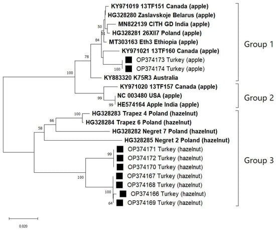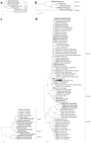 For both MP and CP, isolates in group 3 exhibited greater diversity among themselves than isolates in group 1 and 2, respectively (Table 3). Therefore, the obtained data could also be an indication that group 3 consists of divergent isolates that might be evolutionary adapted to infect certain hosts, especially hazelnut, since no hazelnut isolate was positioned in the other two groups.