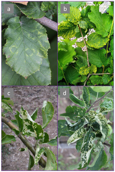 Symptom variation exhibited by ApMV infected plants in Turkey. (a) ‘Oak-leaf patterns’ on hazelnut leaves; (b) Severe form of ‘oak-leaf patterns’ on hazelnut leaves; (c,d) White patches on leaves of two different apple plants.