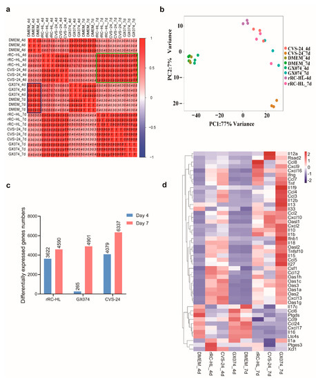 Pearson correlation coefficient analysis showed that the samples were divided into two clusters: one cluster included DMEM-4d, DMEM-7d, and GX074-4d (blue frame) with Pearson correlation coefficients exceeding 0.8, representing extremely strong positive correlations; the second cluster included rRC-HL-4d, CVS-24-4d, rRC-HL-7d, GX074-7d, and CVS-24-7d (green frame) with Pearson correlation coefficients also exceeding 0.8 but distinguished from the first cluster through a correlation coefficient below 0.6 (Figure 2a). The PCA of the complete microglial transcriptomes demonstrated an obvious distinction among the different groups. The DMEM-4d, DMEM-7d, and GX074-4d groups showed similar variance, as did the rRC-HL-4d, rRC-HL-7d, GX074-7d, and CVS-24-4d groups; only the CVS-24-7d group showed no correlation with any other group (Figure 2b). These results showed that the differentially expressed mRNAs in microglia induced by different RABV strains between 4 and 7 dpi in this study were reliable, and the characteristics of microglia cells infected with different RABV strains differed.
