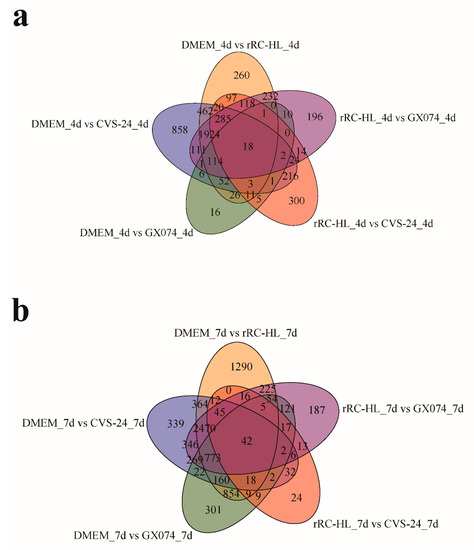 Venn diagram showing unique differentially expressed genes in specific groups of microglia infected with different RABV strains at 4 dpi (a) and 7 dpi (b). Different comparison groups are represented in different colors. The overlapping region displays the number of DEGs in a specific group shared by different comparison groups, and the non-overlapping region represents the number of DEGs in a specific group belonging to one comparison group.