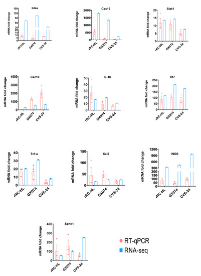 RT-qPCR was used to validate RNA-seq data by verifying DEGs in different groups at 7 dpi. Tnf and Tlr signaling pathways DEGs were selected for RT-qPCR analysis. The primers used for RT-qPCR are shown in Table 1. RT-qPCR validation showed that the mRNA expression levels of DEGs (e.g., Cxcl9, Stat1, and Il-1β) were highly upregulated in the rRC-HL group; Cxcl10, iNOS, and Sphk1 were highly expressed in the CVS-24 group; and Ikbke, IRF7, Tnf-α, and MCP-1 were upregulated in the GX074 group (Figure 4). These findings indicate that the changes in DEG mRNA expression were consistent with those obtained in transcriptomics analysis (Figure 4); thus, the DEG data were reliable.