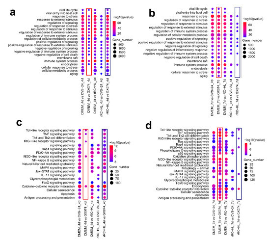 The analysis of GO functional enrichment and KEGG pathway functional enrichment. Bubble diagram at 4 dpi (a) and 7 dpi (b) displaying GO enrichment. The vertical axis represents BP GO terms, and the horizontal axis represents different comparison groups. Increasing circle sizes represent increasing gene numbers; deepening red color indicates higher p-values and greater significant enrichment of GO terms. The ordinate of bubble diagram represents KEGG pathway enrichment at 4 dpi (c) and 7 dpi (d). The vertical axis represents pathways, and the horizontal axis represents different comparison groups. Increasing circle sizes represent increasing gene numbers; deepening red color indicates higher p-values and a greater significant enrichment of the KEGG pathway.