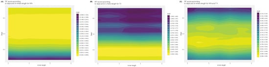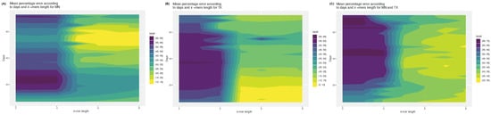 Accuracy for RF as a function of k-mer length and number of days ahead on the three datasets: (A) MN; (B) TX; (C) both states. Color scales range from low (colder hues) to high (warmer hues).