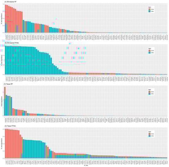 However, the location of the most important k-mers in virulence genes does not imply their direct impact on case numbers, as it is possible that some of these k-mers were important because the models learned how these features differed between the two variants. To gauge this possibility, all the mutations at those k-mer positions were identified, and using the NGDC’s SARS-CoV-2 variation database, their phenotypic impact, graded as low, moderate, and high, was extracted. For both models and both states, there are highly significant differences in importance values across the three classes of phenotypic impact (RF MN: ; RF TX: ; FFNN MN: ; FFNN TX: ). If the results were biologically relevant, one would expect that the most important k-mers should also be those with the largest phenotypic impact. However, this is not the case (Figure 5), suggesting that the most important k-mers found to be predicting case numbers are not involved in virulence.