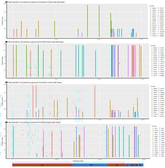 Distribution of the 30 most important k-mers for each model and each individual state along the SARS-CoV-2 reference genome (shown at the bottom of each column). Results for MN are shown for RF (A) and FFNN (B). Results for TX are shown for RF (C) and FFNN (D).