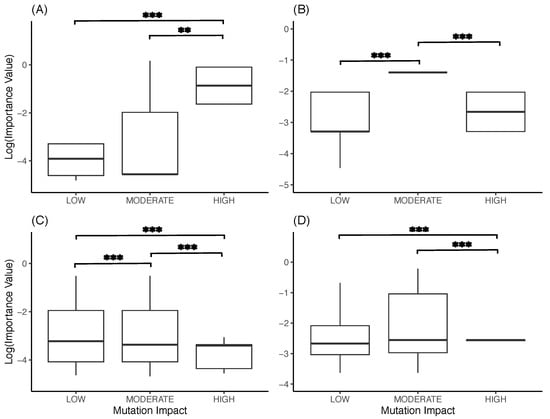 Boxplots of the importance score of k-mers according to the impact of mutations found in them. (A) RF model for Minnesota. (B) RF model for Texas. (C) FFNN model for Minnesota. (D) FFNN model for Texas. Significance was assessed with a Kruskal–Wallis test **: p < 0.01; *** p < 0.001.
