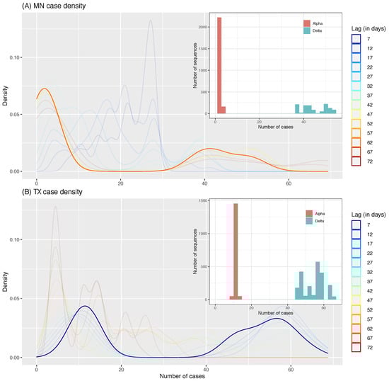 Density distribution of cases to predict in our dataset according to the lag. (A) is the dataset for Minnesota and (B) is for Texas. The warmer colors represent the distribution for longer ℓ, colder colors represent the distribution for shorter ℓ, and the solid line highlights the distribution for the lag that gave the best accuracy. Insets show the number of sequences of each variant matched to case numbers to predict for that solid line distribution.