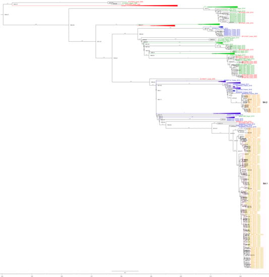 The dataset with 384 HVR1/2 IBV GI-23 sequences was also evaluated. Again, an independent branch with all Brazilian, one Israel and several European (from Poland, Romania and Turkey) IBV GI-23 sequences was also observed. However, this clade also included sequences from China, South Africa (KSA) and Egypt. Importantly, Brazilian IBV GI-23 could be clearly separated into two subclades (SA.1 and SA.2), suggesting at least two different viral ancestors (Figure 1).