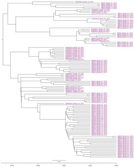 The dataset with the 200 IBV GI-23 S1 complete sequences from Brazil and other countries was used to construct a preliminary phylogenetic and temporal tree. The IBV GI-23 Brazilian reference sequence (SB-2805, 2021) clustered together with other IBV GI-23 sequences from Israel (2006), Poland (2015 to 2020), Romania (2016 to 2020) and Turkey (2014 to 2019) in a very characteristic and independent branch. A first estimate showed that SB-2805 was probably introduced into Brazil between 2018 and 2019 (Figure S1).