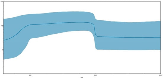 Furthermore, all 120 HVR1/2 sequences from Brazil showed that the tMRCA dates to around 2018 (Figure 2). The evolutionary rate for these 120 Brazilian HVR1/2 sequences was predicted to be 5.1 × 10−3 replacements/site/year (95% HPD = (1.9 × 10−3) to (8.6 × 10−3)). The Bayesian skyline assessment showed that the population of 120 Brazilian HVR1/2 sequences underwent an increase between July 2020 and January 2021. From January 2021 to approximately December 2021, it remained at a constant high. From December 2021 to January 2022, it suffered a drop until the current year (Figure 3).