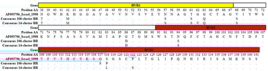 Schematic representation of amino acid substitutions present in AF093796, consensus 106-cluster BR (SA.1) and consensus 14-cluster BR (SA.2) in HVR1 (yellow) and HVR2 (red) region. Amino acid changes are represented with a different letter and those that were conserved are indicated with dots.