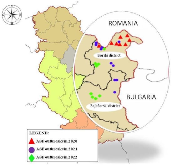 The first case of ASF in a domestic pig herd in Serbia was confirmed in 2019 in backyards in a village in the central region of the country []. Shortly afterward, in January 2020, the first case was detected in a wild boar population that occurs predominantly in open hunting grounds in counties close to the country’s borders with Romania and Bulgaria []. Numerous outbreaks were later reported in feral pigs near the border area in southeastern Serbia from 2020 to the end of 2022 []. It was reported that in two counties bordering the country, ASF outbreaks in domestic pigs frequently overlapped with the occurrence of ASF in wild boar populations, suggesting that regional prevalence in wild boars is an important risk factor for domestic pig populations [].