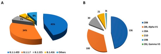 Distribution of the different clades and lineages of SARS-CoV-2 in the Dakar and Thiès regions of Senegal. (A) Distribution of 291 genotypable individuals into 16 lineages according to the PANGOLIN (Phylogenetic Assignment of Named Global Outbreak Lineages) classification. Lineage B.1.1.420 was the major lineage (131/291, 45%,), followed by lineage B.1.1.7 (100/291, 34%), B.1.525 (21/291, 7%) and B.1.416 (16/291, 6%). The remaining lineages (A.27, B.1, B.1.160, B.1.617, B.1.629, B.1.1, B.1.1.318, P.2, R.1 and P.1.14) represented 8% of the sequences. (B) Distribution of the 291 genotypable sequences into six Nextstain clades using the Nextclade web tool. Clade 20B was predominant (136/291), followed by clade 20I, Alpha V1 (100/291) and clade 20A (30/291). Clades 21D, 19B and 20J Gamma V3 contained 21, 3 and 1 of the genotypable sequences, respectively.