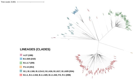 - Rambaut, A.; Holmes, E.C.; O’Toole, Á.; Hill, V.; McCrone, J.T.; Ruis, C.; du Plessis, L.; Pybus, O.G. A dynamic nomenclature proposal for SARS-CoV-2 lineages to assist genomic epidemiology. Nat. Microbiol. 2020, 5, 1403–1407. [Google Scholar] [CrossRef]