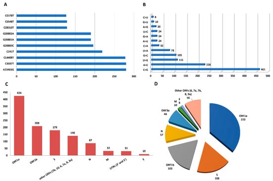 Representation of the mutational analysis of 291 whole genome sequences of Senegalese SARS-CoV-2. (A) Representation of the 10 most frequently detected SNPs (Single Nucleotide Polymorphisms): A23403G, C3037T, C14408T, C241T, G28883C, G28881A, G28882A, C28310T, C5548T and C5178T. (B) Representation of the 10 most frequent nucleotide substitutions. Among the 1125 SNPs, the following 10 nucleotide substitutions were the most common: C>U transversion, G>U transversion, A>G transition, U>C transversion, G>A transversion, A>U transversion, G>C transversion, U>A transversion, C>A transversion, U>G transversion, A>C transversion and C>G transversion. (C) Distribution of SNPs in different regions of the Senegalese SARS-CoV-2 genomes. The greatest number of SNPs was counted in ORF1a, followed by ORF1b and the S gene. A total of 140 SNPs were counted in the other ORFs (Open Reading Frames). A total of 87, 32 and 10 SNPs were counted in the genes coding for the N, M and E proteins, respectively. A total of 31 SNPs were identified in the 5′ and 3′ UTRs (UnTranslated Regions) of the Senegalese SARS-CoV-2 genomes. (D) Distribution of non-synonymous mutations across different regions of the genomes. Non-synonymous mutations were found in all coding regions of the Senegalese SARS-CoV-2 genomes. The largest number of non-synonymous mutations was found in ORF1a while the smallest number was found in ORF6.