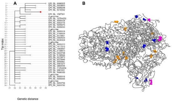 Representation of the Senegalese isolate of the Gamma sublineage (P.1.14). (A) Phylogenetic analysis of the Senegalese isolate P.1.14. The isolate was linked to 59 genomes classified as gamma variants of concern in the Global Initiative on Sharing Avian Influenza Data (GISAID) database. These gamma variants originated from the United States, Canada, Mexico, Argentina and Brazil. The Audacity Instant application in GISAID was used to generate a phylogenetic tree. Branch lengths are based on the genetic distance (the number of estimated mutations). Sequences in the tree are designated by their GISAID accession numbers or the number of genomes in the group. The Senegalese isolate P.1.14 is represented on the tree by a red dot. (B) 3D structural visualization of the spike glycoprotein of the Senegalese isolate P.1.14. The 10 amino acid changes identified in the Senegalese isolate in comparison with the Wuhan reference sequence are visualized by colored balls according to the following legend: non-synonymous mutations with a possible phenotypic effect are colored in yellow: L18F, K417T, D614G; non-synonymous mutations with an unknown effect are colored in pink and blue: T20N, P26S, D138Y, T1027I, P1162S, V1176F, H655Y.
