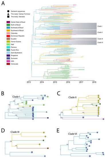 - Giovanetti, M.; Faria, N.R.; Lourenço, J.; Goes de Jesus, J.; Xavier, J.; Claro, I.M.; Kraemer, M.U.G.; Fonseca, V.; Dellicour, S.; Thézé, J.; et al. Genomic and Epidemiological Surveillance of Zika Virus in the Amazon Region. Cell Rep. 2020, 30, 2275–2283.e7. [Google Scholar] [CrossRef]