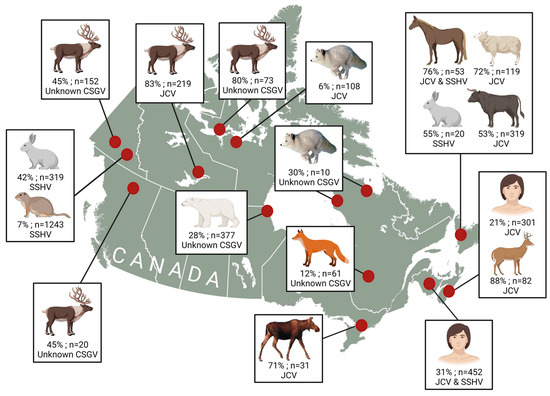 - Buhler, K.J.; Dibernardo, A.; Pilfold, N.W.; Harms, N.J.; Fenton, H.; Carriere, S.; Kelly, A.; Schwantje, H.; Aguilar, X.F.; Leclerc, L.M.; et al. Widespread exposure to mosquitoborne California serogroup viruses in caribou, Arctic fox, red fox, and polar bears, Canada. Emerg. Infect. Dis. 2023, 29, 220154. [Google Scholar] [CrossRef]