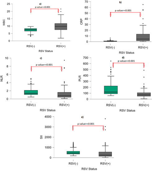 Real-time reverse transcriptase–polymerase chain reaction (RT–PCR) of nasopharyngeal swabs is the current gold standard for testing for RSV, as it requires cost-effective, easily applicable markers. Recently, studies evaluating the roles of complete blood count (CBC) elements and their ratios to each other in determining systemic inflammation and their use as disease activity markers have become quite common due to their low cost and easy accessibility. Among these, parameters such as the neutrophil–lymphocyte ratio (NLR), platelet–lymphocyte ratio (PLR), and mean platelet volume have not been adequately studied in RSV [7]. The systemic immune–inflammation index (SII) is a similar inflammatory marker used as a prognostic predictor in various diseases such as COVID-19 [8]. It is calculated by the following formula: peripheral neutrophil count x platelet count/lymphocyte count.