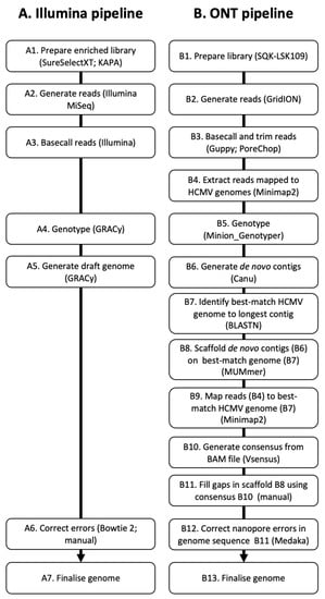 The pipelines used to generate sequence data from the samples and assemble the HCMV genomes are summarised in Figure 1. The key steps in the Illumina pipeline (A1–A7) and the ONT pipeline (B1–B13) are summarised in the legend and referred to in the descriptions below.