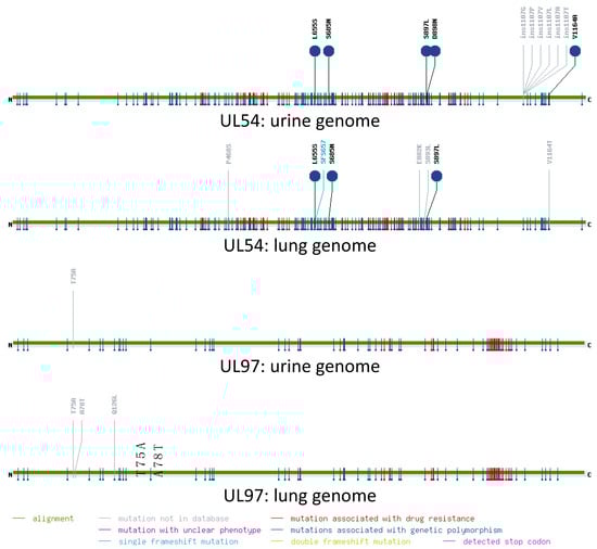 The coding sequences of genes UL97 and UL54 were analysed using a web-based mutation resistance analyser (MRA,; https://www.informatik.uni-ulm.de/ni/mitarbeiter/HKestler/mra/app/index.php?plugin=form, accessed on 16 June 2021) [].