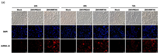 BV2 cells were either mock-treated or infected with ZIKVPE243 or ZIKVMR766 with different MOIs, as mentioned before. After 24, 48, or 72 hpi, cells were fixed with 4% paraformaldehyde in PBS for 20 min, washed in PBS twice, and permeabilized with 0.1% Triton X-100 (Sigma Aldrich) plus 3% bovine serum albumin (BSA—Sigma Aldrich) for 25 min. Then, cells were pre-stained with anti-dsRNA J2 antibody (0.1 mg/mL, Ref: RNT-SCI-10010200, Jena Bioscience GmbH, Jena, Germany), followed by anti-mouse IgG conjugated to PE (1 µg/mL, Ref: A32744, Invitrogen, Waltham, MA, USA), and DAPI. Cells were analyzed by immunofluorescence, using a Zeiss Axioimager d2 microscope and 63× magnitude.