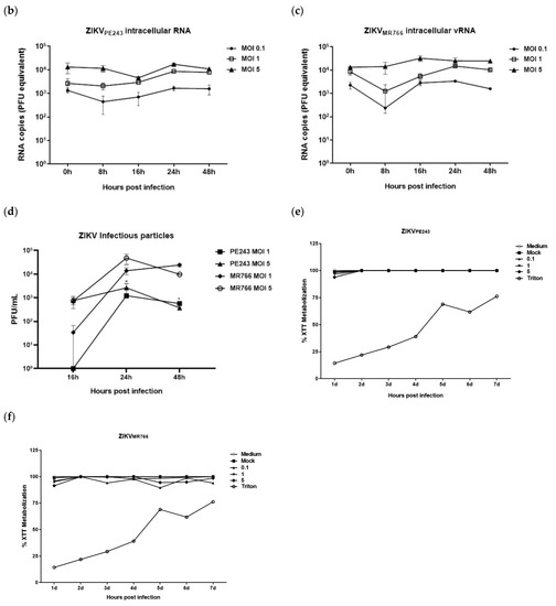 BV2 cells were infected with ZIKPE243 or ZIKVMR766, and determination of cell viability was carried out using XTT 2,3-Bis-(2-Methoxy-4Nitro-5-Sulfophenyl)-2H-Tetrazolium-5-Carboxanilide (XTT) (Sigma-Aldrich) with MOIs of 0.1, 1, and 5, at different time points. Cells were incubated with XTT solution for 2–4 hpi, and metabolization was evaluated by spectrophotometry at 450 nm OD. A positive control using 1% Triton X100 was used included.