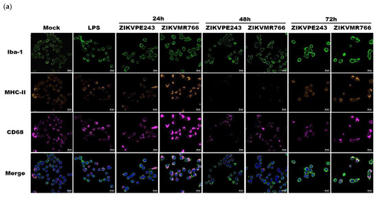 BV2 cells were mock-treated, infected with ZIKVPE243 or ZIKVMR766, with an MOI of 1, or stimulated with LPS + ATP as a positive control. After 24, 48, and 72 hpi, cells were fixed and permeabilized as described previously. Then, the cells were incubated overnight with the primary anti-Iba1 antibody at 1:500 (Wako, code 019-19741), anti-CD68 antibody at 1:500 (Bio-Rad, MC1957, Hercules, CA, USA), or with anti-MHC II conjugated with phycoerythrin—PE (eBioscience, San Diego, CA, USA, ref. 12-5322-81). The cells were then stained with the respective anti-IgG secondary antibodies conjugated to AlexaFluor488 or AlexaFluor647. To stain cell nuclei, a mounting medium containing 4,6-diamidino-2-phenylindole (DAPI) (blue) (Vectashield—Vector Laboratories, Mowry Ave Newark, CA, USA) was used. Fluorescence microscopy was performed simultaneously with the same antibody solutions, and all micrographs were taken with the same settings using a Zeiss LSM 710 confocal microscope equipped with a 63× objective and digital imaging system (Roper Scientific camera and Zen (black edition) software).