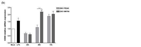 Firstly, we investigated the susceptibility and permissiveness of murine BV2 microglial cells to ZIKV. To assess this, BV2 cells were infected with ZIKVPE243 or ZIKVMR766 at MOIs of 1 or 10, and the expression of ZIKV dsRNA was analyzed by immunofluorescence. ZIKVPE243-infected BV2 cells exhibited a lower infection level compared to ZIKVMR766-infected cells when using an MOI of 10 (Figure 1a), whereas, with an MOI of 1, the signal infection was not clearly detected.