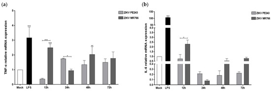 We also investigated the expression of anti-inflammatory miRNAs 146a and 124, known to regulate the expression of TRAF6, IRAK-1, and MAVS essential adaptor proteins required for type I IFN production, as well as the pro-inflammatory proteins TNF-α and IL-6 [50,51,52]. At 24 hpi, BV2 cells infected with both ZIKV strains showed a significant increase in miRNAs 146a and 124, with higher levels observed in cells infected with ZIKVMR766 (Figure 5a,b). While the expression levels of miRNA146a decreased at later times, miRNA124 levels remained high until 48 hpi in ZIKVPE243-infected cells (p < 0.01). The transcript expression level of TRAF6 inflammatory protein increased remarkably at 12 hpi with both strains compared to mock-infected cells (p < 0.001 in both strains), followed by a decrease to levels similar to mock at later time points (Figure 5c). IRAK1 expression showed a delayed pattern, starting at 24 hpi and reaching significant differences from mock-infected cells only at 48 hpi (p < 0.05 for ZIKVMR766) and 72 hpi (p < 0.001 for ZIKVPE243) (Figure 5d).