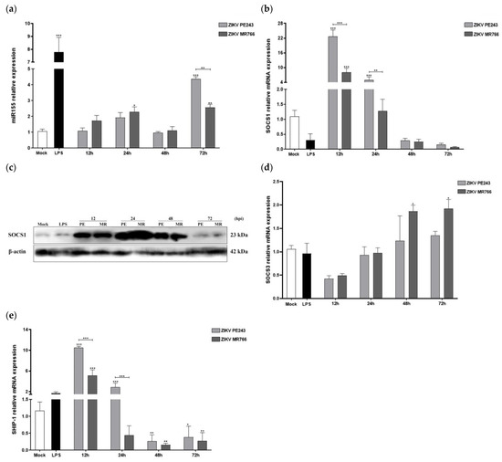 The analysis of socs1/ship1 gene expression, cellular targets of miRNA 155, showed that both ZIKV strains induced a significant early increase at 12 hpi, followed by a gradual decline at later times (Figure 4b,e). ZIKVPE243-infected cells showed significantly higher mRNA expressions levels than ZIKVMR766-infected cells at 12 hpi (p < 0.001 on both genes) and 24 hpi (p < 0.01 and p < 0.001 for socs1 and shpi, respectively) (Figure 4b,e). Representative Western blot analysis and quantification data confirmed the higher ZIKVPE243-mediated SOCS1 protein expression at the early phase of ZIKV infection (12 and 24 hpi) (Figure 4c). Regarding the expression of SOCS3, there was an increase in expression over time, without significant difference in the early stages of infection (12 and 24 hpi), with a greater increase in cells infected with the ZIKVMR766 strain at later stages (p < 0.05 in both) (Figure 4d).